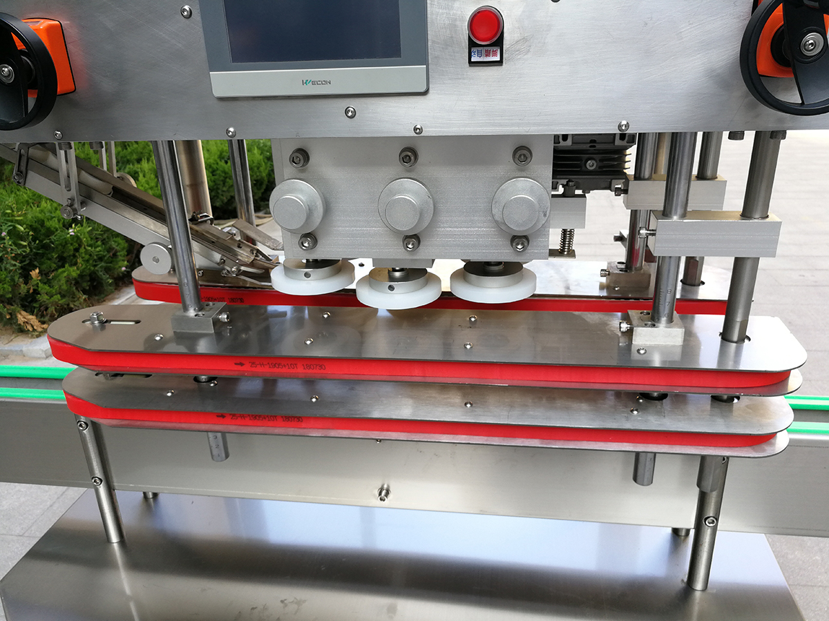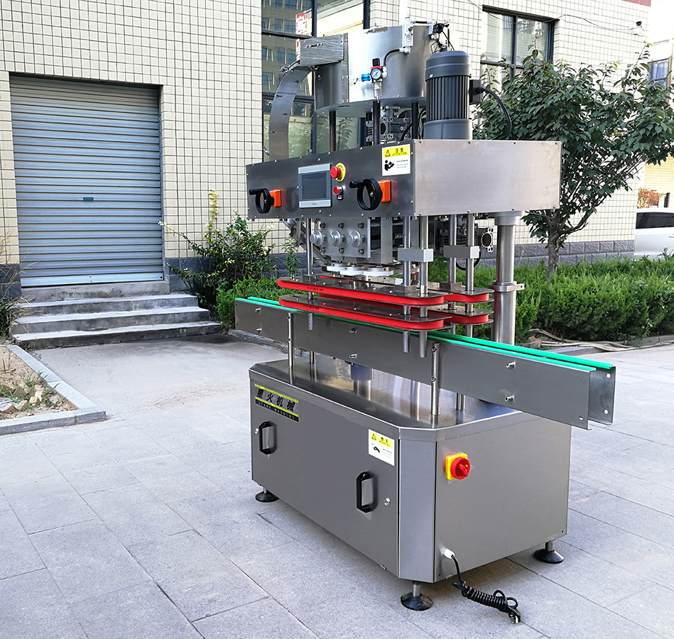 XH-160B型全自動(dòng)直列式壓蓋機(jī)是我公司很新改進(jìn)的一種新型壓蓋機(jī)。四臺(tái)調(diào)速電機(jī)分別用于供蓋、夾瓶、傳送、壓蓋,機(jī)器自動(dòng)化程度高,穩(wěn)定性好,調(diào)節(jié)方便、更換瓶型或蓋時(shí)無需備件,只需作調(diào)整即可完成(如配上蓋機(jī),可進(jìn)行自動(dòng)上蓋)。外觀美觀大方、靈巧、壓蓋速度快,合格率高,可適用于食品、醫(yī)用、化工、飲料等行業(yè)的不同瓶形的旋蓋。