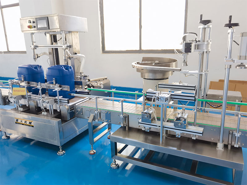 全自動(dòng)稱重式灌裝機(jī)械的核心工作方式,主要是以重量定體積,以此不受物料密度、溫度、粘度變化影響,以此確保灌裝精度的統(tǒng)一性,工作人員在18公斤稱重灌裝機(jī)的顯示屏幕內(nèi)設(shè)定好灌裝參數(shù)規(guī)格,輸送帶會(huì)將空的容器桶送至灌裝工位,氣動(dòng)擋桶機(jī)構(gòu)于定位裝置會(huì)在協(xié)同的作用下將其卡定在下料處,稱重傳感裝置將實(shí)時(shí)檢測(cè)空桶內(nèi)的重量信息,并將灌裝的數(shù)據(jù)反饋至PLC控制系統(tǒng)內(nèi),自動(dòng)進(jìn)行記錄并扣除桶重,灌裝閥在開(kāi)啟的那一刻,按雙速灌裝模式進(jìn)行物料輸送,當(dāng)達(dá)到慢灌閾值時(shí),PLC控制灌裝閥切換流量,當(dāng)重量達(dá)到18公斤設(shè)定值時(shí),立即關(guān)閉灌裝閥,完成灌裝。